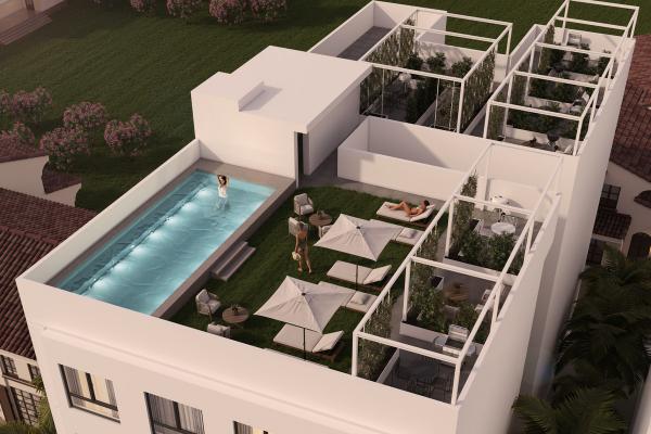 Modern building with 19 one- and two-bedroom apartments, a saltwater pool, and a communal garden.