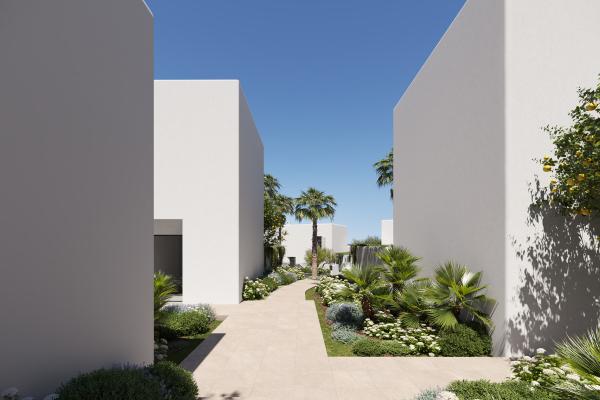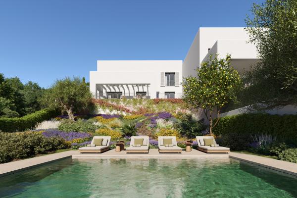The development comprises 49 homes, each with a private swimming pool and garden, distributed across three distinct typologies: