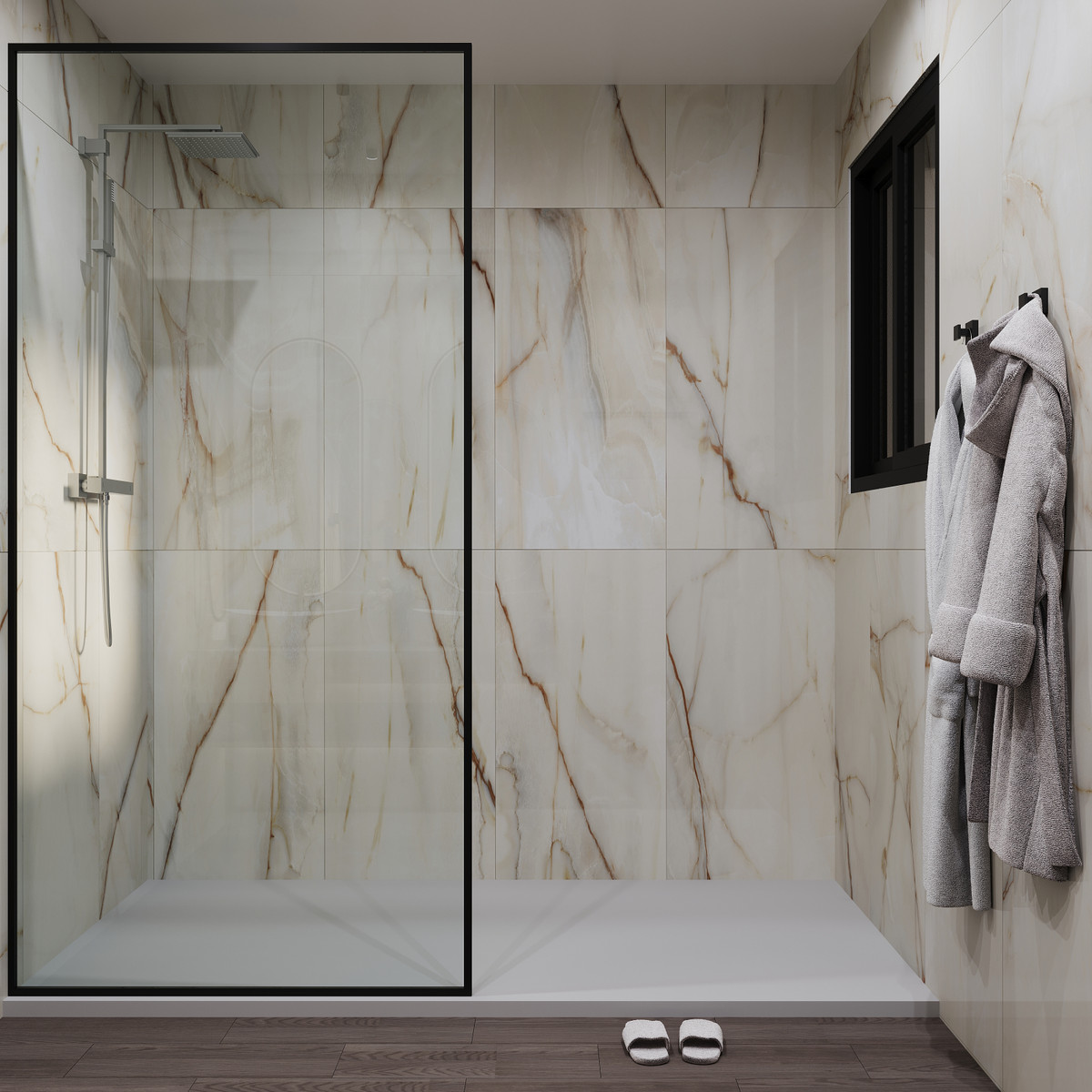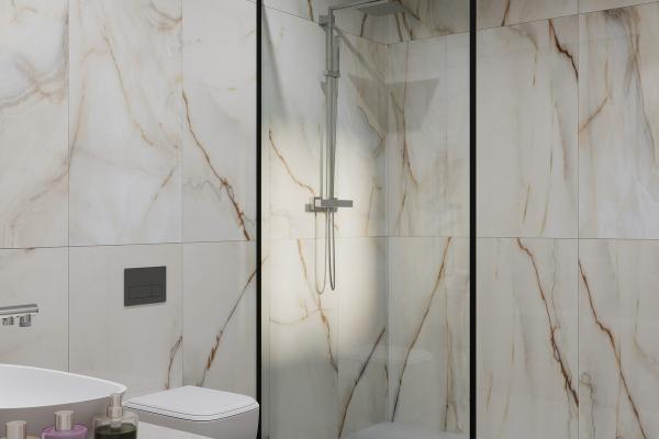 It also includes an impressive designer kitchen, a guest toilet, and a generous terrace with direct access to the garden and pool area.