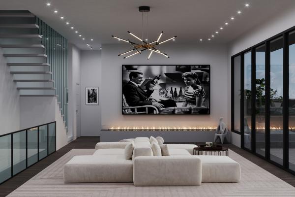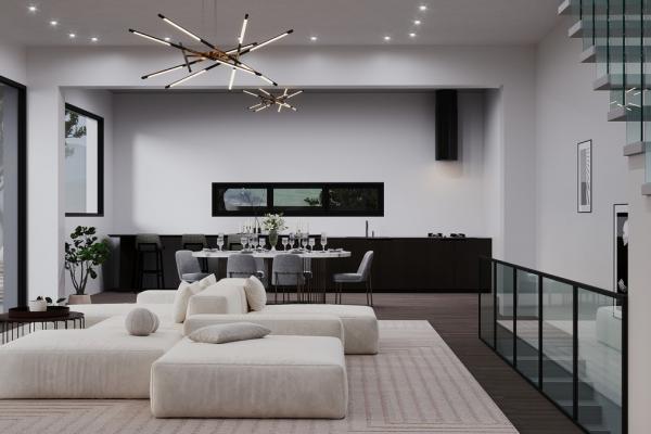 The ground floor features a stunning, spacious living room with large windows that flood the interior with natural light.